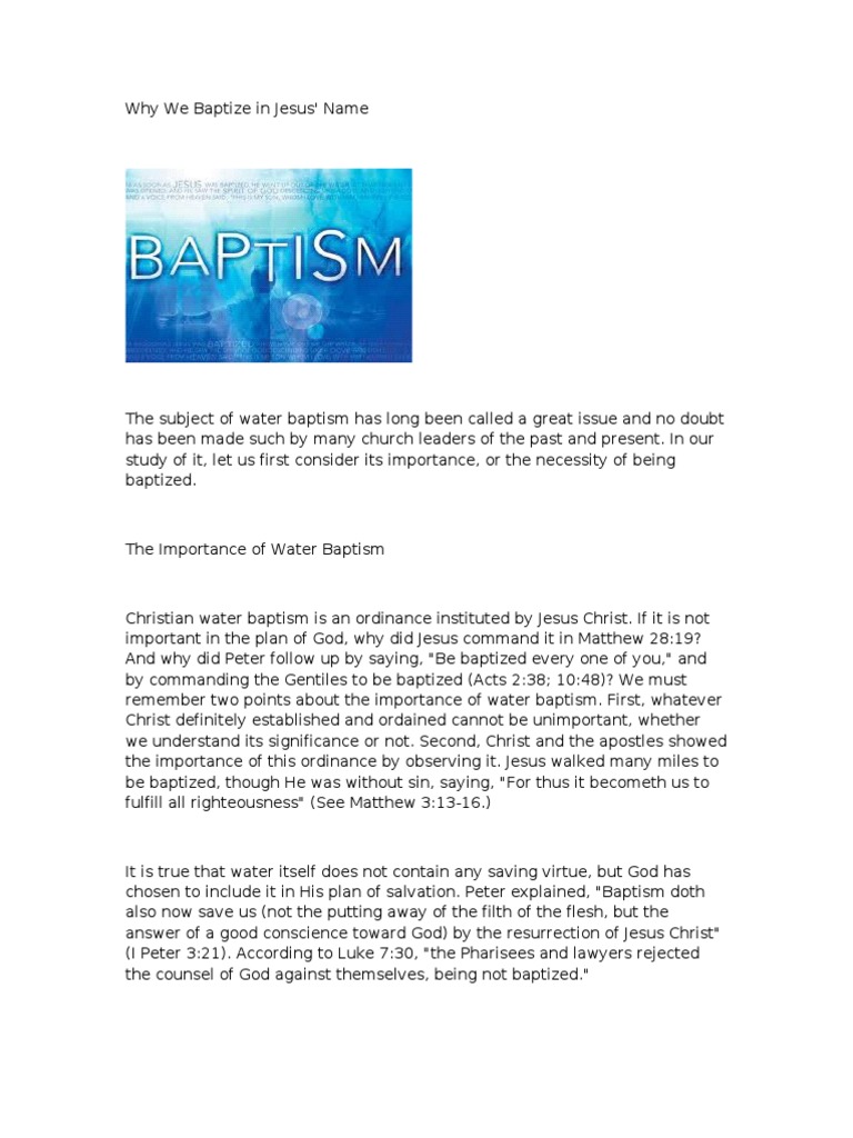 Jesus has been shown to be the the name of jesus christ is the distinctive one in christian baptism and really involves the father and the spirit. Jesus gave very explicit instructions on how to baptize in matthew 28:19 but that ain't good enough for these people. Jesus is the greater person john has been telling people about, so. There can still be seen today, all over the city, baptismal pools, with steps leading down to the bottom, that were used to baptize people, almost certainly by immersion. But why are you baptizing someone in the name of the father, and of the son, and of the holy spirit?